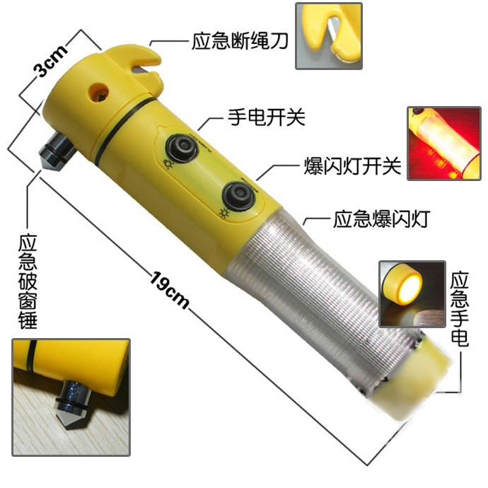 用途:主要用于紧急情况下敲碎玻璃逃生用 锤子敲击玻璃 手柄尾部刀片用于割断安全带逃生。