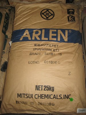 日本三井:CH230、C430、C645、E430N、E440N、CH230N、CH240N、CH245N、A3000,C230,C230N,C430N,CE2200,CH230N,CH230NK,E430NK-T5,E430N-T5,E630NK-BK,MN-400,E630N,CH320N,E630NK,EL630N1.优异的耐焊接性PA6T具有很高的熔点(310℃),其热变形温度也很高(约290℃),因此可显现优异的耐焊接性(reflowsolderability)。优异的耐焊接性使PA6T特别适用于表面黏着技术(SMT)用电子连接器。2.优良的高温刚性PA6T在高温下仍可维持相当高的模数,譬如说在120℃时的模量为23℃时模量的55%。也就是说PA6T在广泛温度范围间可维持稳定而且优良的刚性。3. 优良的耐化学品性4.吸水率低对于尼龙树脂而言,PA6T的吸水率相当低,仅为尼龙66的1/4至1/3。因此,PA6T因吸水所造成的物性变化相对较小。5.优良的尺寸稳定性PA6T的吸水率相当低,因吸水而造成的尺寸变化相当小。PA6T的热膨胀系数相当稳定,在高温范围中仍然维持在相当低的水准,因此,对温度变化的尺寸稳定性良好。此外,PA6T因成型过程所造成翘曲很小。也就是说PA6T具有优良的尺寸稳定性。6.优良的流动性PA6T具有良好的熔融流动性,很容易以射出成型来加工。此外,PA6T还具有优良的薄壁成型性,使其适于小零件的加工成型。7.成型时不易起毛边PA6T也拥有尼龙所固有的一个特性,在射出成型时不易起毛边。