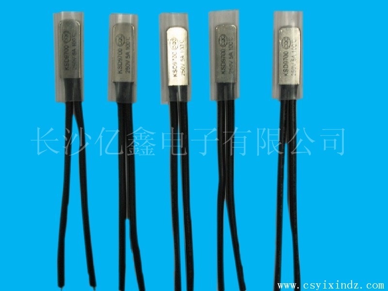 KSD9700型热保护器是由导热PBT外壳、焊有银合金触点的双金属元件、导电支架、绝缘固定座、静触片及耐热导线等元件组成。全封闭的结构能使元件免受灰尘或杂质的污染,防止漆液的渗透及外力的损坏。由于外壳是金属导电体,在使用时配置有导热且耐温的绝缘套管。电流通过有阻抗的双金属元件,遇非正常工作时,随电流增大或周围温度升高至设定温度值时,双金属元件迅速动作,打开触点,切断电路。当装置冷却到安全工作温度时,触点自动闭合,恢复正常工作状态。广泛应用于单相、三相电机由于过载、堵转等非正常工作状态下引起的电机过热保护,也适用于扼流线圈、螺旋真空管以及变压器等一般电器的过热保护和温度控制。