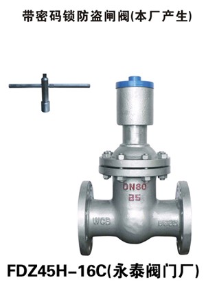 温州市龙湾永中永泰阀门厂,本阀门已获国家实用新型专利,专利号(200730146187.7)(200720143482.1)最新型的防盗锁,使本防盗闸阀的防盗性能是同类产品的256倍.目前在市场上使用的阀盗阀门的防盗锁是5根锁芯的,密码数是1-4那么,要破解的话只要4*4*4*4*4=1024次,大概只要20几分钟就能破解,在各大油田使用防盗阀门的已失去了原有的防盗性能,使广大使用者造成巨大财产损失,针对这一情况,我们研制了最新型的防盗锁,6根锁芯.密码数字由1-8组成,要破解的话要8*8*8*8*8*8=262144次才能破解,是他们的256倍,大概需要5120分钟一个人要3天4夜不吃不睡才能破解.(建议密码一个星期改一次那么盗窃分子永远也破解不了)