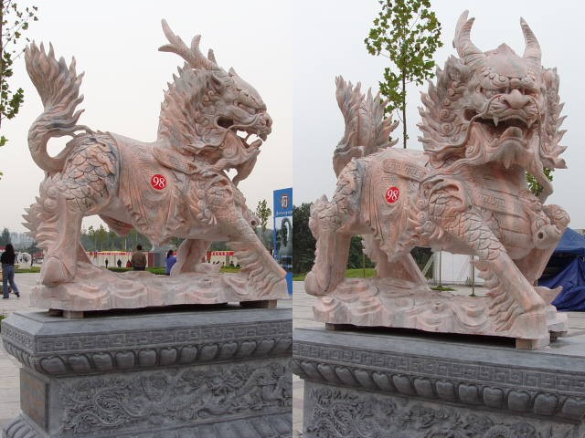 中国徽商银行麒麟和中国国际石雕艺术大道,其中1.5公里的路段上,经全国知名院校的雕塑专家,民俗专家创作,经我们雕刻再创作的各种造型,寓意的麒麟,是世界麒麟大全另外现在香港中国银行门前的石雕麒麟,还有中国人民建设银行的汉白玉貔貅,也是我们参照大气自然的汉代石雕样式,雕刻出的气魄深沉雄浑貔貅.就是由我们精心雕刻的祁佑我们国家银行日金斗金,财源茂盛!