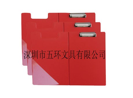 3)制作要求:红色PVC胶料包1500克纸板,摊开压三角插袋,右面板钉金属板夹,方便夹零散资料