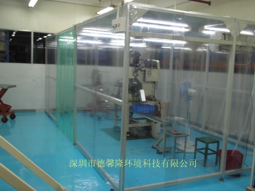 1.洁净棚结构:材料以40x40或40x80mm工业铝型材作为框架,采用风机滤网送风单元FFU送风,四周用防静电垂帘或防静电有机玻璃,顶部铺盖密缝盲板,形成一个密缝区,内部净化级别可达10000-100级;特别适用于车间内局部净化级别要求高的区域,如流水线作业区域、高精确度产品组装区。