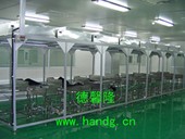 1.洁净棚结构:材料以40x40或40x80mm工业铝型材作为框架,采用风机滤网送风单元FFU送风,四周用防静电垂帘或防静电有机玻璃,顶部铺盖密缝盲板,形成一个密缝区,内部净化级别可达10000-100级;特别适用于车间内局部净化级别要求高的区域,如流水线作业区域、高精确度产品组装区。