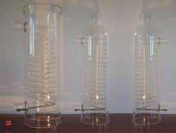 玻璃冷凝器又称玻璃冷却器,玻璃换热器,玻璃热交换器,被广泛地应用在化工工艺的冷却,回流化工生产中。本玻璃仪器也称作玻璃热交换器,玻璃换热器适用于化工物料的蒸馏,回流的冷凝操作。由于结构紧凑,体积小,并且每节间采用锥形法兰口连接,组装灵活,可以用“串联”或“并联”方式进行组装,满足不同冷却面积的需要。