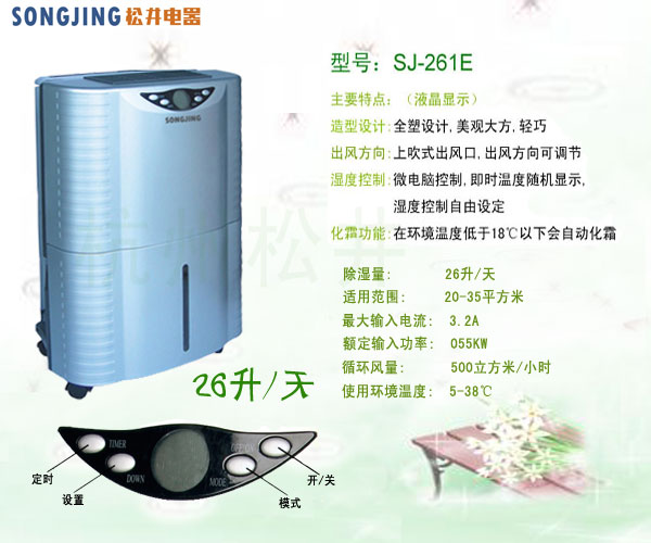 松井除湿机由压缩机、热交换器、风扇、盛水器、机壳及控制器组成,其工作原理是:由风扇将潮湿空气抽入机内,通过热交换器,此时空气中的水份冷凝成水珠,变成干燥的空气排出机外,如此循环使室内湿度降低。