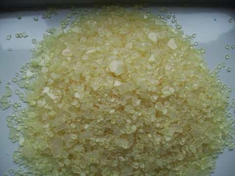 外观:为乳白色,黄色至深褐色片状或粒状固体,透明而有光泽