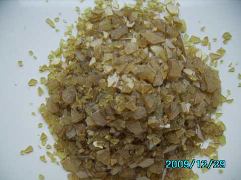 外观:为乳白色,黄色至深褐色片状或粒状固体,透明而有光泽