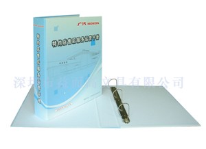 材质:文件夹封面采用157克铜板四色印刷广汽本田公司LOGO及资料,过哑膜压纹,包1500克灰板,里纸为空白128克书纸,钉3孔D型铁夹。