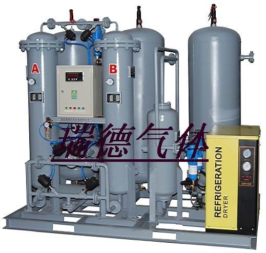 空气压缩机提供的压缩空气首先通入压缩空气净化组件中,压缩空气先由管道过滤器除去大部分的油、水、尘,再经冷冻干燥机进一步除水、精过滤器除油、除尘,并由在紧随其后的超精过滤器进行深度净化。根据系统工况,瑞德公司特别设计了一套压缩空气除油器,用来防止可能出现的微量油渗透,为碳分子筛提供充分保护。设计严谨的空气净化组件确保了碳分子筛的使用寿命。经本组件处理后的洁净空气可用于仪表空气。