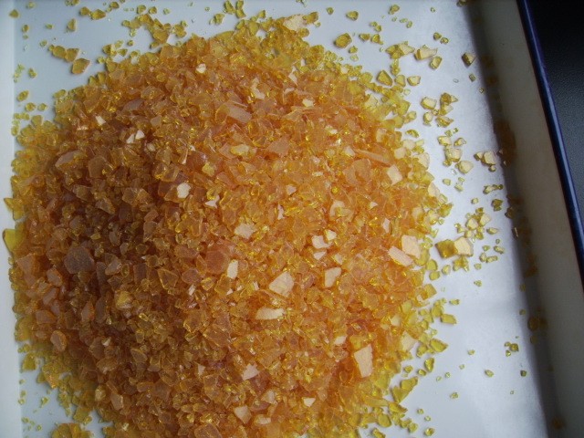 外观:为乳白色,黄色至深褐色片状或粒状固体,透明而有光泽