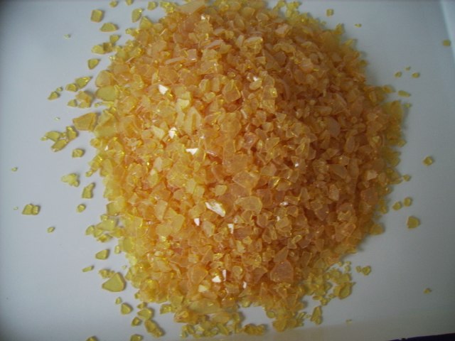 外观:为乳白色,黄色至深褐色片状或粒状固体,透明而有光泽