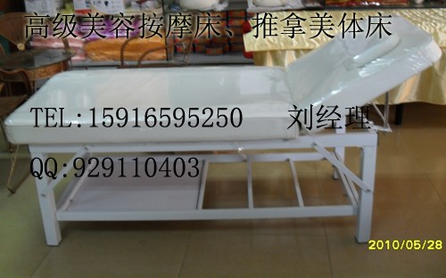 说明:此床为美容院必备仪器之一,同时亦可做家庭自用按摩床。美容床为美容院、女子会所、美体按摩会所常见家私之一,其独特的结构设计有助于做美容过程中的各种颈部角度要求。