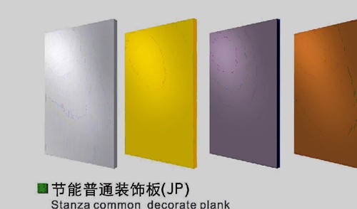 节能普通装饰板(JP)是选用20mm-75mmXPS挤塑聚苯板为芯材,其导热系数在25oC时小于0.029W/(m.K),其压缩强度大于400Kpa,具有完全的闭孔性,拉拔强度可达0.2mpa,是一种优良的保温隔热材料;采用喷有氟碳涂料漆或仿石漆的纤维增强硅酸钙板作面板,四个侧边有边板。面板有耐酸碱,耐候自洁,抗冲击等功能。边板有控制板材变形和安装挂件之作用;芯板与面板及侧板间均采用本公司发明专利技术专用粘结剂复合;背板为低碱度硫铝酸盐水泥、石英砂、耐碱玻璃纤维网格布以及其它粘结剂组合而成,便于与墙体粘贴,其强度大,粘结牢靠。节能普通装饰板是受专利保护的“专有技术”。
