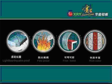 二,XRY节能装饰板系列中的节能铝塑装饰板及其幕墙系统中铝的用料可节省50%,人们熟知传统单层铝板幕墙,铝层厚度为2.5mm—3mm,。后来为了节约铝材和初级节能,开发了铝塑板幕墙,铝塑板铝层厚度为面层0.5mm,底层0.5mm。而XRY节能铝塑装饰板铝层的厚度为面层0.21-0.30mm,底层0.21-0.30mm从而达到节约铝材50%。每平米节约铝材价50元。全国现在每年外墙用铝塑板近1亿平米,按XRY节能铝塑装饰板湿贴(挂贴)系统计算,每平米安装完工造价350-400元之间,比传统铝塑板幕墙塞上保温的做法造价每平米500-600元相比,每平方米节约了150-200元。XRY节能铝塑装饰板及其幕墙系统若得到推广全国每年可节约资金近200亿元。
