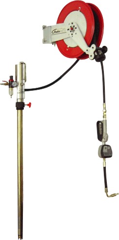 利用压缩空气作为动力,推动柱塞泵往复运动,把10-30米软管加油盘固定于车间墙壁、天花板、立柱、支架上,根据加油工位距离的远近,自由拉动连接油枪的伸缩软管盘,进行润滑油输送和加注的。通过软管盘与计量显示加油枪连接,输出油料,数字显示流量,计量准确,操作简便,实现车间润滑油或其他类似流体的加注,适用于180-1000L大桶油料的加注。加油系统是目前汽车修理厂,汽车4S站,快速换油服务中心,车间生产线等领域首选加油设备。