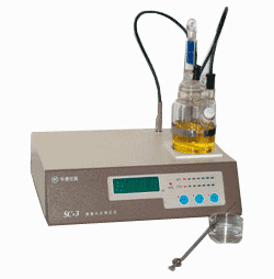 SC-3微量水分测定仪简介 该仪器采用卡尔-菲休滴定法测定性质不同的固体、液体、气体中微量水分的含量。具有测量精度高、速度快、测定数据稳定可靠等优点,广泛应用于石油、化工、电力、环保、医药等部门。主要技术指标: 滴定方式:电量滴定法;电解电流:0 ̄300mA;测定范围:10ug ̄30mg;灵 敏 阈:1ugH2O;准 确 度:10ug-1mgH2O不大于5ug;大于1mgH2O不大于0.5%;电 源:AC220V±10%;频 率:50HZ±5%;消耗功率:25VA。
