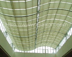 FTS 天棚帘:适用于水平、垂直、倾斜或弯曲的玻璃天幕顶。它具有面料张力强、遮阳面积大、操作灵活等特点 , 国内外著名大工程应用甚多。这一系统采用两个法国 SOMFY FTS 专用电机 , 电子控制以调节面料的张力。在机构停止时 , 静态张力会使面料收紧绷直 , 更贴近建筑结构。