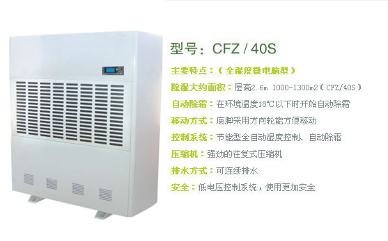 G:CFZ/40S 除湿量:960升/天全电脑湿度控制,湿度显示,自动化霜,适用面积:1000-1300㎡