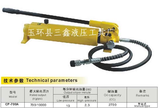 最大输出压力700/10000,每分钟输出油量低压13cc ,高压2.3cc ,储油量2700cc ,重量14kg。采用2M高压油管,附快速接头