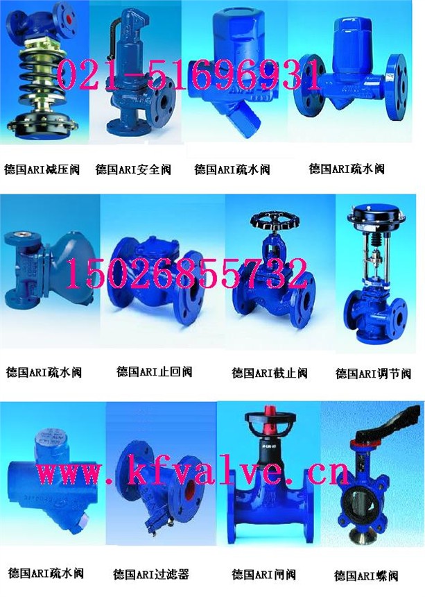 德国ARI阀门波纹管密封截止阀 TYPE:FIG12.046;FIG22.046;FIG23.046 零泄露阀门,特别适用于蒸汽,导热油及各种特殊介质,DN15-400,PN16-PN40,材质:铸铁/球墨铸铁/碳钢/ 不锈钢 ,德国ARI阀门电动/气动二、三通调节阀 TYPE:FIG12.440/441;FIG22.440/441;FIG23.440/441 用于各种介质的精确调节,应用在各种自动控制系统等百分比或线性流量特性,材质:铸铁/球墨铸铁/碳钢 /不锈钢 ,DN15-150,PN16-PN40,PTFE-V形圈/石墨填料/波纹管密封 德国ARI阀门减压阀 TYPE:FIG.701自力式减压阀 双波纹管结构-平衡波纹管 密封波纹管 DN15-100,PN16-PN40 材质:铸铁、球墨铸铁、碳钢,下游压力:0.2-16BAR范围内可选 德国ARI阀门安全阀 TYPE:FIG.900系列;FIG.920系列;FIG.940系列 标准式、全启式,法兰连接和螺纹连接,DN15-150,PN16-PN40,材质:铸铁/球墨铸铁/碳钢/不锈钢 德国ARI阀门过滤器 TYPE:FIG.050系列;FIG.059系列;FIG.080系列 法兰连接和对旱连接,DN15-300,材质:铸铁,球墨铸铁,铸钢 德国ARI阀门疏水阀 TYPE:FIG.631系列;FIG.632系列;FIG.633系列;FIG.634系列 内螺纹连接和法兰连接,特性:在压力和排量变化的情况下均可排水;内置自动排气元件;结构坚固,不 易受水锤影响; 止回结构,防止冷凝书倒流;可配接头,用于连接平衡管和旁通;安装形式可改动,可在现场把垂直安装 改为水平安装 德国ARI阀门止回阀 TYPE:FIG.003系列;FIG.004系列;FIG.030系列;FIG.039系列;FIG.063系列 法兰连接和堆焊连接,阀体材质:铸铁,球墨铸铁,铸钢,锻钢,不锈钢
