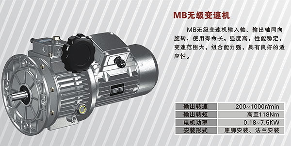MB无级变速机输入轴、输出轴同向旋转,使用寿命长。强度高,性能稳定,变速范围大,组合能力强,具有良好的适应性。