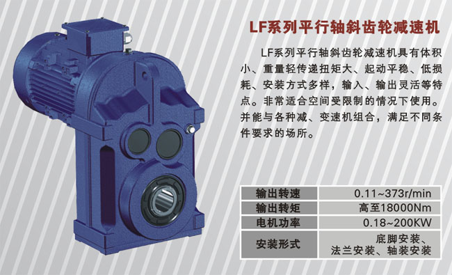 LF系列平行轴斜齿轮减速机具有体积小、重量轻传递扭矩大、起动平稳、低损耗、安装方式多样,输入、输出灵活等特点。非常适合空间受限制的情况下使用。并能与各种减、变速机组合,满足不同条件要求的场所。