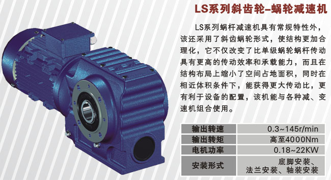LS系列蜗杆减速机具有常规特性外,该还采用了斜齿蜗轮形式,使结构更加合理化,它不仅改变了比单级蜗轮蜗杆传动具有更高的传动效率和承载能力,而且在结构布局上缩小了空间占地面积,同时在相近体积条件下,能获得更大传动比,更有利于设备的配置,该机能与各种减、变速机组合使用。