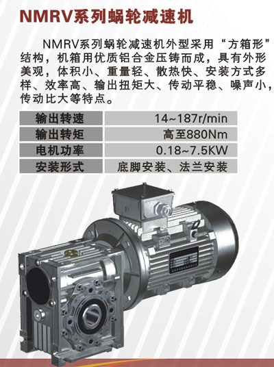 NMRV系列蜗轮减速机外型采用“方箱形”结构,机箱用优质铝合金压铸而成,具有外形美观,体积小、重量轻、散热快、安装方式多样、效率高、输出扭矩大、传动平稳、噪音小,传动比大等特点。