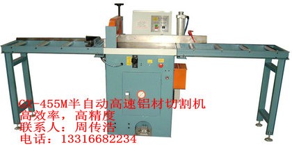 GX-455M气动半自动高速铝材切割机:采用钨钢圆锯片切割,机器锯片转速每分钟3200转,切割铝材断面光洁无毛边,断面不需再加工,锯片由下往上切割,安全可靠,特别适用于铝门窗、相框、散热片、音响面板、塑钢材、电木板、铝挤型、纸管及铝型材等精度有要求的切割下料锯切.主要优点: 1.隐藏式锯片,低噪音,安全性高。 2.脚踏式开关,自动压料,锯料。 3.使用12mm橡胶块压料,不易损坏工件 4.可单支或多支一起锯切。 5.进口配件,800mm长入料导板可提高锯切精度。 6.自动两侧喷油,油量可分开调整,切面无毛边,锯片更耐用规格参数:型号:455SA 锯切能力: 锯片最大直径?455 mm 锯切角度90o切割45o切割锯切铝型材(厚宽比) 厚度x宽度厚度x宽度方型25x 304mm100x 100mm方型(空心)50x 279mm圆型76x 254mm圆管110x110mm圆型(空心)110x 228mm异型材127x 203mm最大锯片切宽度300 mm最大锯片切厚度125 mm锯片转速3200 RPM锯片尺寸