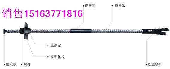由钢质涨壳锚头、中空注浆锚杆体、止浆塞、垫板、螺母组成。
