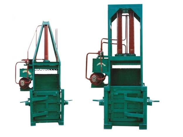 液压打包机包括支架,支架带有底板和前后侧挡板,支架上安装有千斤顶,千斤顶带有活塞杆,活塞杆右端连接有竖直的推料板,推料板右侧面连接有推料板条,相邻推料板条之间的空隙为板上穿绳槽;支架上面右部带有压料上挡板,压料上挡板左侧的支架上面带有进料口;前后侧挡板右侧的支架上分别固定连接有前后侧挡条,相邻侧挡条之间的空隙为穿绳口;支架右端带有出料口,出料口处的支架右端铰接有门板,门板左侧面连接有门板条,相邻门板条之间的空隙为门上穿绳槽;前后侧挡板、推料板和底板围成的空腔为进料腔,前后侧挡条、压料上挡板、门板和底板围成的空腔为挤料腔;门板和支架右端固定连接有锁定装置。并可根据需要在一定范围内调节打包的大小。