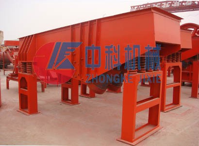 振动给料机在生产流程中,可把块状、颗粒状物料从贮料仓中均匀、定时、连续地给到受料装置中去,在砂石生产线中可为破碎机械连续均匀地喂料,并对物料进行粗筛分,广泛用于冶金、煤矿、选矿、建材、化工、磨料等行业的破碎、筛分联合设备中。