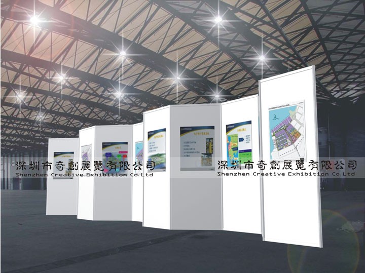 展墙/标准展板:是采用国际通用标准而设计制作的,每张规格为宽1.0m*高2.5m,每张和每张组合可以无限延伸,可以组合成“一”字,“W”,“L”,“Z”,…,等很多种摆放的造型,主要器材组成为:八棱柱、八棱柱锁件、联板、双面pvc展板、其特点是装卸快捷,角度变换,易装易拆,便于运输,节省存储空间。适用于画展,宣传,摊位,背景,围挡