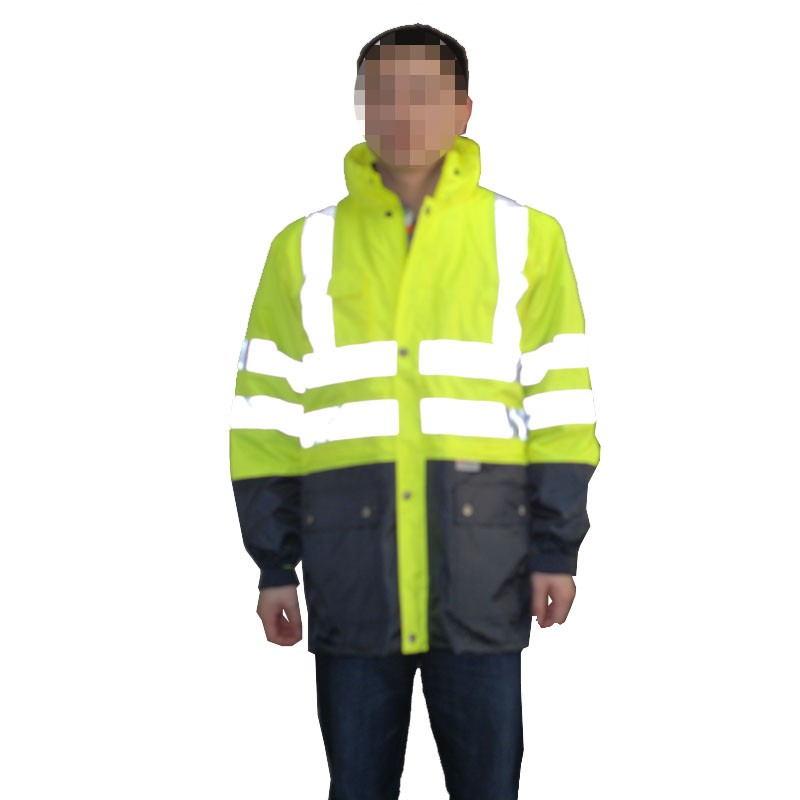 款式:内胆可脱卸、内胆袖子也可脱卸设计;帽子可折叠到衣领中;整件衣服可要脱卸成外套、棉夹克、棉马夹,功能性强,舒适、美观;高警示服,反光效果好