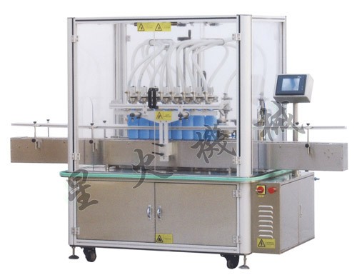 本自动液体灌装机为8头灌装机,人机界面与PLC通讯,调试设备或更换品种只需在屏幕上设定, 进瓶、定位、灌装充填、出瓶均自动作业,灌装时瓶子不到位、瓶子堵塞或出液管没有插进瓶子时设备将自动保护,排除后继续作业,进口减速电机无级调速控制灌装柱塞缸,不仅适合各种水剂,亦适合稠粘液体,与物料接触部件为316L不锈钢、硅橡胶,符合GMP规范,充填量一次调整完毕,每个容积缸可分别微量调节,灌装精度高且一致性好。