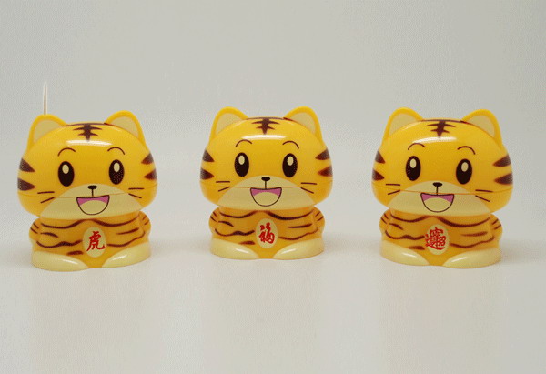 可爱的卡通小老虎造型,自动牙签盒,彩盒包装,虎年促销品的最佳之选