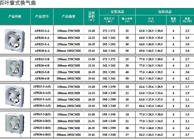 换气扇:天花板式换气扇、管道式换气扇、橱窗式换气扇、浴室换气扇、挂墙式换气扇等型号;