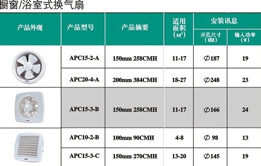 换气扇:天花板式换气扇、管道式换气扇、橱窗式换气扇、浴室换气扇、挂墙式换气扇等型号;