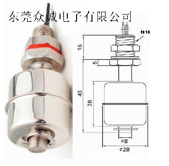 磁簧开关触点材料为铑(表层覆盖氧化铑),接点寿命可达200万次。 磁簧开关的特殊处理可使其在200℃高温下正常使用。 可实现多点控制,每个控制点的位置可根据客户需要定制。有SUS304、SUS316L、PP、PVDF、PTFE等材质可供选择。 长度可任意定制(Lmax≤5m)不锈钢液位开关SUS304不锈钢导杆,螺母,SUS304不锈钢浮球,耐高温180度,耐压2.0Mpa,可控制电磁阀、水泵,或作缺水保护,溢水报警。不锈钢浮球开关产品技术参数: