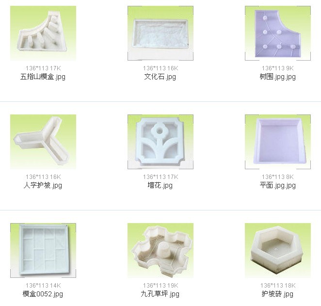 我厂模具部主要产品:彩砖塑料模盒,广场砖模盒,水泥砖塑料模盒,便道砖塑料模盒,光亮砖塑料模盒,井盖塑料模具,雨水蓖子塑料模具,路侧石塑料橡胶模具,路沿石砖塑料橡胶模具,护坡砖塑料模具,植草砖塑料模具,树围塑料模具,花池塑料橡胶模具,彩瓦塑料模具,水泥瓦塑料模具,三通模具,侧排水模具。颜料球磨车间主要产品;彩色面料,彩砖面层料,彩砖耐晒绿,彩砖光亮剂,彩砖氧化铁红,铁黄,铁绿,水磨石专用绿色浆,液压砖面料。