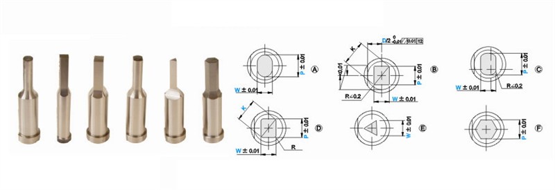 本公司专业生产销售冲针,可根据客户需求选用SKD11,SKH-51,钨钢等材质进行来图、来样定做。SKD11真空淬火硬度:58-60, SKH51热处理硬度:59-62。如:T冲,A冲,引导冲,k型抽芽冲,子母冲,各种成型冲针等,加工工艺先进,并可进行镀钛处理。欢迎咨询订购。