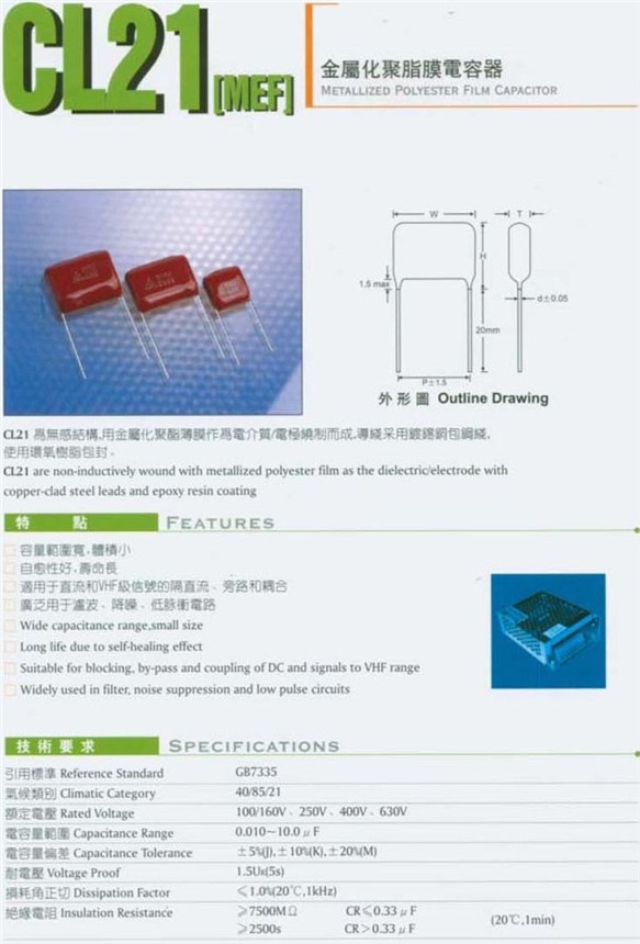我公司主要生产CL21系列金属化聚脂膜电容器、CL11聚酯膜电容、CL21X-B超小型壳子金属化聚酯膜校正电容、CBB21系列金属化聚丙烯膜电容器、CBB13型金属箔式聚丙烯膜电容器、X2系列抑制抗干扰安规电容器、CL20/CBB20系列金属化聚酯膜及金属化聚丙烯膜轴向电容器、CBB81系列金属化聚丙烯膜高电压大电流电容器、CBB6系列金属化交流电动机用电容器、Y1//Y2陶瓷安规交流电容器等近几十种品种、数百种规格。代理分销的原装品牌有: Murata、TDK、Samsung、AVX/KEMET 、YAGEO、ST、TOSHIBA、ON、宇阳、风华、长电、宝光、仙童等,产品包括:贴片电容、电阻、钽电容、二三极管、集成电路、光耦、三端稳压。主要为信息产业、通讯设备、照明器材、仪器仪表、电源、节能光源及家用电器、医疗电子、音像设备、汽车电子等整机行业配套.