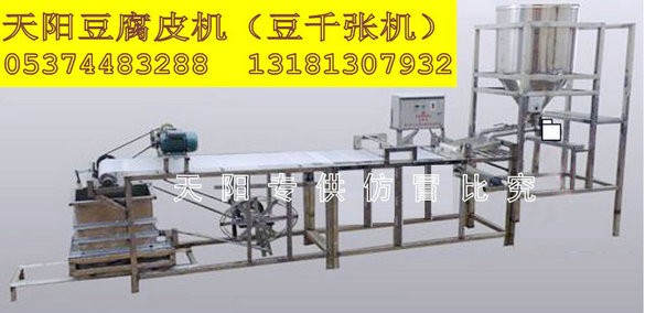 豆腐皮(豆千张)是我们日常生活中最常见常吃的豆制品,营养丰富,易于保存,农贸超市、小商店以及餐馆饭店均有销售,市场需求量极大。但目前市场上的豆腐皮均由手工作坊生产,卫生条件差,产量低,外观不整齐,厚薄不一致,缺乏市场竞争力,曲阜天阳机械公司研制生产的全自动豆腐皮机。天阳豆腐皮机由泼皮机、压榨机、扒皮机组成,全自动操作,关键部件使用高级不锈钢制造,完全符合卫生标准。天阳豆腐皮机具有搅拌泼皮、传送折叠、压制卷布、自动压榨、自动剥皮等流水作业功能。天阳豆腐皮机制作快,成张性好,使用220伏或380伏电源,占地20平方,150公斤/小时。天阳豆腐皮机所生产的豆腐皮保持了传统优质豆腐皮的口感和风味,呈淡黄色半透明状,薄厚均匀,厚薄可调(0.2-3毫米)韧性好,落水不糊,入口细 腻,有香味,不论凉拌小菜,煎炒,打汤,烩菜,均是美味佳肴。天阳豆腐皮机具有投资少,效益高,回报快的特点,开创了豆腐皮生产新纪元,是目前生产豆腐皮的最新型致富机械详情请致电13181307932咨询张杰。