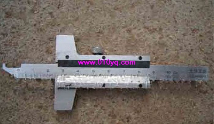 一种混凝土碳化深度测量尺,尺身上有以mm为单位的刻度,尺框套装于尺身,尺框上固定有游标,游标刻度与尺身刻度的对比观测值精度为0.01mm,尺身的横截面呈长方形,其端头单侧收缩为有尖状顶面的测头,该测头一侧边与尺身平直,在尺框邻接测头直边的一侧固接有一量爪,该量爪的工作面与尺身垂直;本实用新型可以很准确地测量混凝土的碳化深度,测量分度值小,量程大,操作简单,测量结果准确。不仅可以用于混凝土强度的检测,也可用于混凝土耐久性和腐蚀深度的检测。