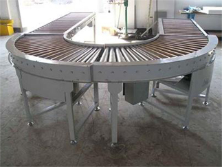 弯道辊道输送机采用锥辊做载体,可以平稳的将物品随弯道输送。驱动方式有单链驱动、双链驱动、环型“0”