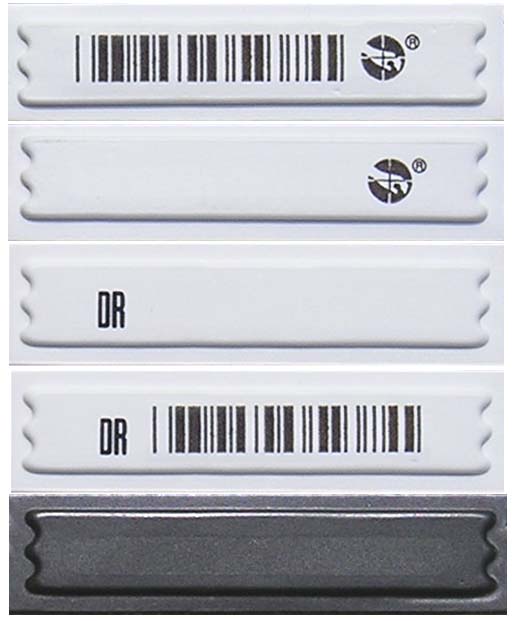 DR Sensormatic label声磁软标签右侧有小手图标,单个标签尺寸为45.21×10.67×1.89mm,常用型号有:ZLDRS1白色光面、ZLDRS2条形码、ZLDRS5黑色三种。