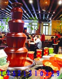 近年,在台湾刮起了一阵巧克力的旋风,迅速的在云林、台北、高雄等地如同燎原的星火一般的发扬开来。那么,被东方人完全接受,独特的口味成为其发展起来必不可少的一个条件。巧克力喷泉散发着浓郁的奶香,搭配来自农场的新鲜水果,酸甜滋味尽在其中,清新香甜的水果包裹着香醇的意大利黑巧克力,时尚男女简直是无法抵挡。将顶级深黑巧克力、牛奶巧克力和时令水果做搭配,吃起来有着甜甜蜜蜜的满足,完全不会有甜腻的感觉,香浓的热溶巧克力沾裹在水果串上,光看就垂涎三尺,尝一口,果然是好滋味!