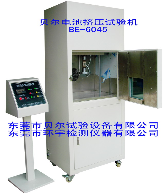 大电池挤压试验机/电池挤压试验机/电池压缩试验机—贝尔专业生产 本公司主要致力于锂电池挤压试验机的研发与生产,是兼研发、生产、销售于一体的专业试验设备有限公司,我们愿与您携手共创高质量的产品! 因为专业 所以信赖 锂电池挤压试验机技 术 参 数: 控制方式与特色:用BE-3815控制,其特点能保留最大值,可储存12组测试值,并有延时功能。 型 号: BE-6045 最 大 压 力: 150N~13KN 显 示 压力精度: ±0.5 Kg 压 缩 空 间: 30 X 40 X 30 CM(可调) 使 用 电 压: 220V±10% 50HZ 防 爆 箱 尺 寸: 1300X600X800mm(HXDXW) 防 爆 箱 要 求:底下装有四个万向滑轮,可自由移动 防 爆 目 的 : 防止电池炸伤及周围人与事物. 挤压(液压)试验: 1.电池被两个平面板夹住; 2.平板的挤压力液压式压力传动(250N) 3.电池被稳固夹住后,挤压力开始,直至升至液压油缸数显2500psig(17.2Mpa)时,两板之间压力为3000pound(13KN)时,压力突然释放,或持续一段时间钟(时间可0~10min自由设定) 4.电池直径平行于板,对于方型电池,需要旋转90度再挤压 250N压力试验: (气压) 1.设备可提供恒定250N+-10N(56-+2pound)的压力,持续至少5S钟(时间可设定); 2.机械式施力设置; 3.电池分别挤压两侧、顶部、底部等面 本公司接受订制非标规格电池挤压试验机 感谢您对我们公司产品的关注! 贝尔公司专业生产电池挤压试验机|锂电池挤压试验机|电池针刺试验机|手机跌落试验机|电池冲击试验机|高低温试验箱,塑胶橡胶类试验设备,包装检测设备,环境检测设备,拉力试验机等系列产品欢迎来电咨询! 关键字:电池挤压试验机,锂电池挤压试验机,挤压试验机,液压式电池挤压试验机,气压式电池挤压试验机