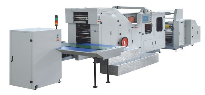 本机用于筒料制作方底纸袋,是将原色或印刷好的卷筒纸由本机一次完成上边胶、原料成筒、切断、底部压痕、底部涂胶、袋底成形、出袋。是生产食品袋、手提袋的理想设备。整机由计算机中央控制系统控制,触摸屏显示,伺服电机控制制袋长度,可生产多种规格的纸袋。